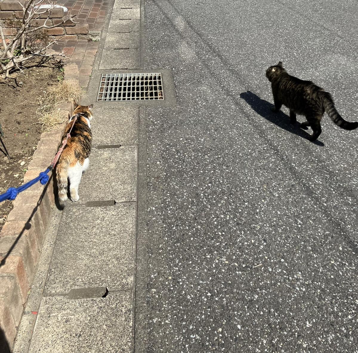 写真はブログに全然関係のない、我が家の猫の散歩風景です。野良猫と逢引しております。