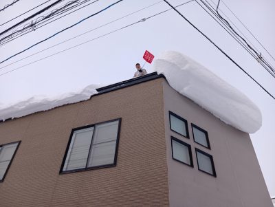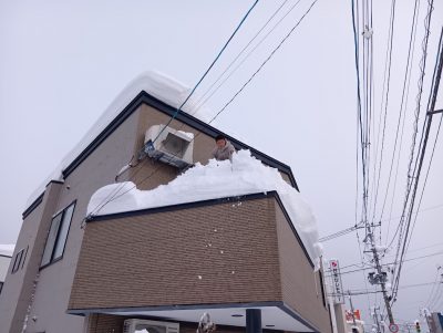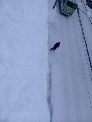 歩行者さんに注意して、どっさり積もった雪を落としていきます。