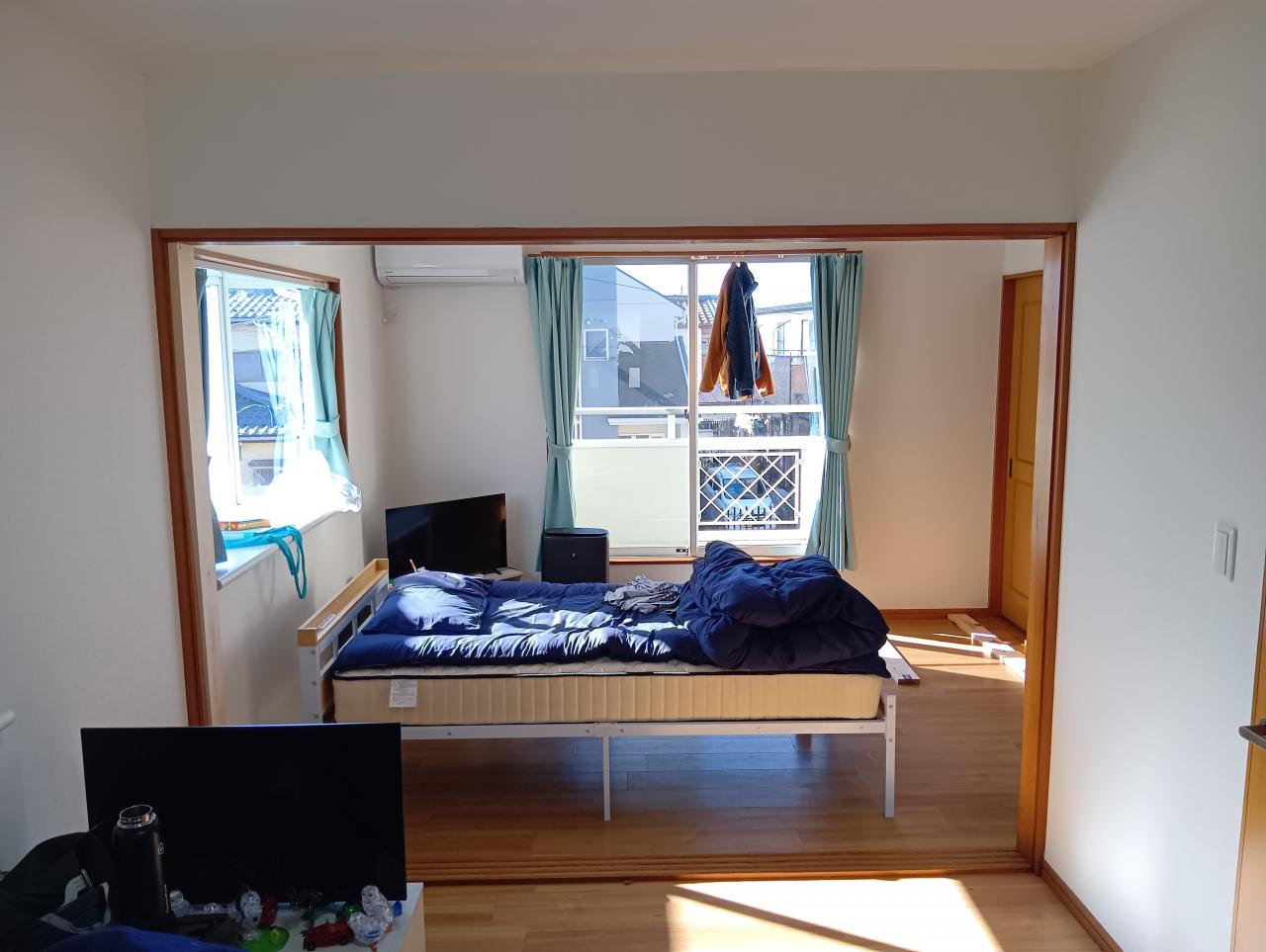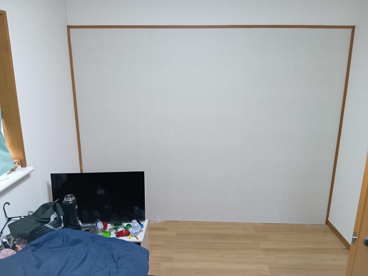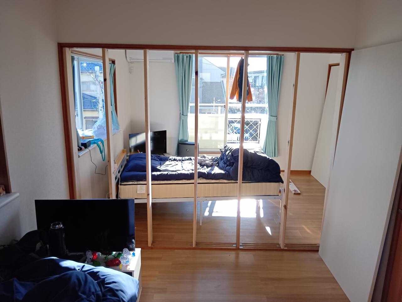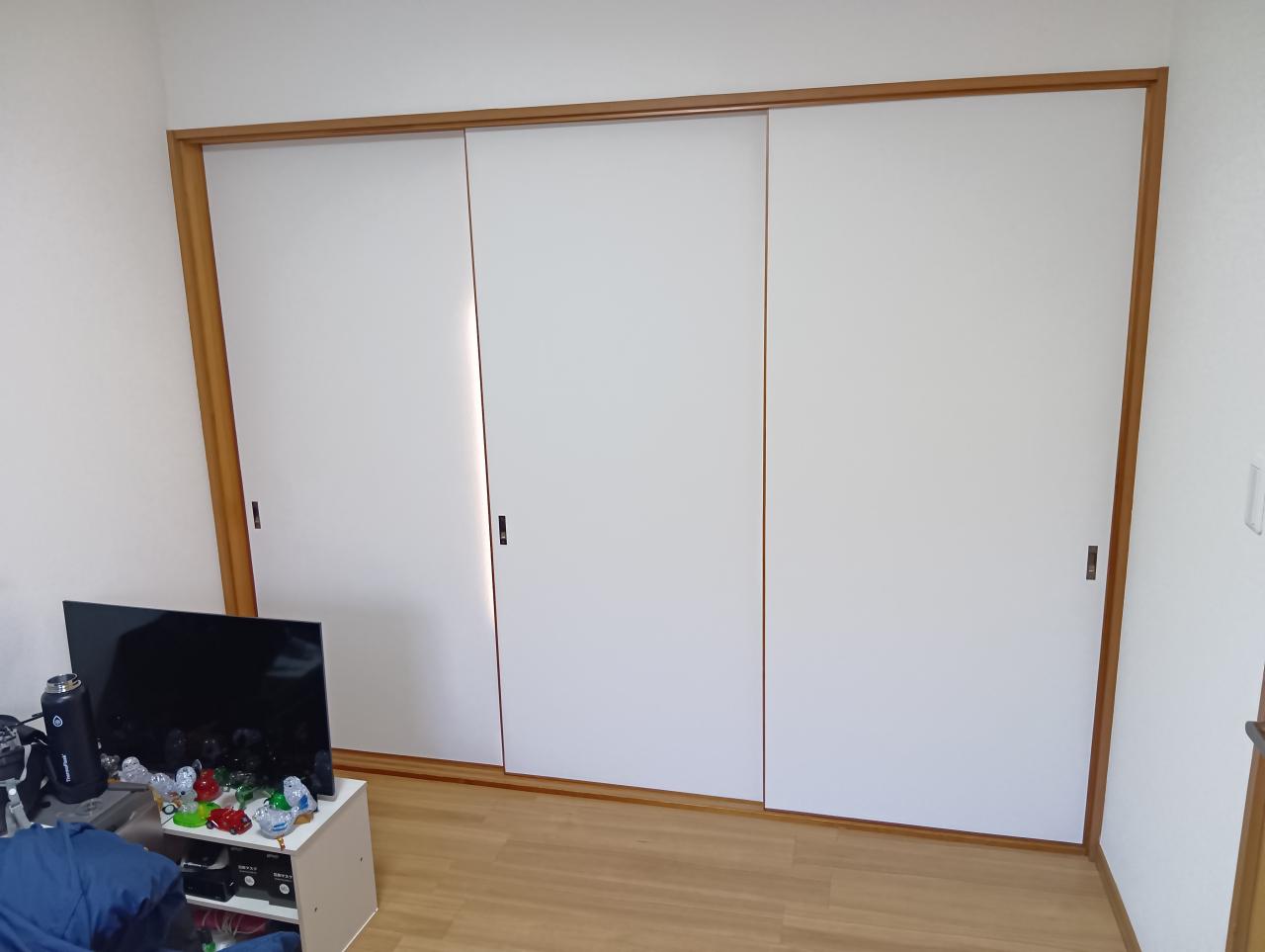 会社からの特命(?)を受け、「がじゅまるのいえ春日部」の2階にあります、続き間になっている洋室2部屋の間仕切3枚引違戸部分を壁にし、両部屋の入居者様のプライバシーを完全に確保する為の大工工事に行きました。